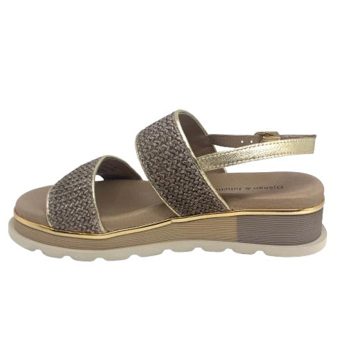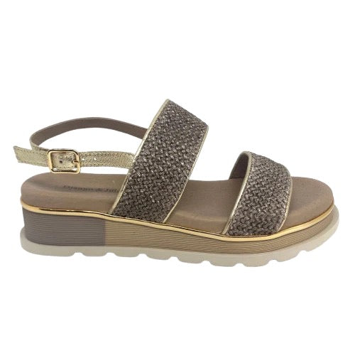 A low summer wedge in mocha raffia with a gold trim. It features two bands across the foot and a gold leather back strap. Can be dressed up or worn casual.